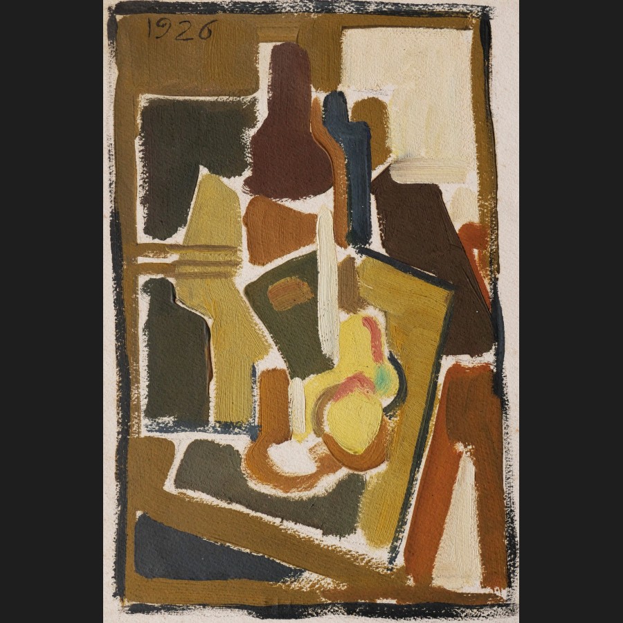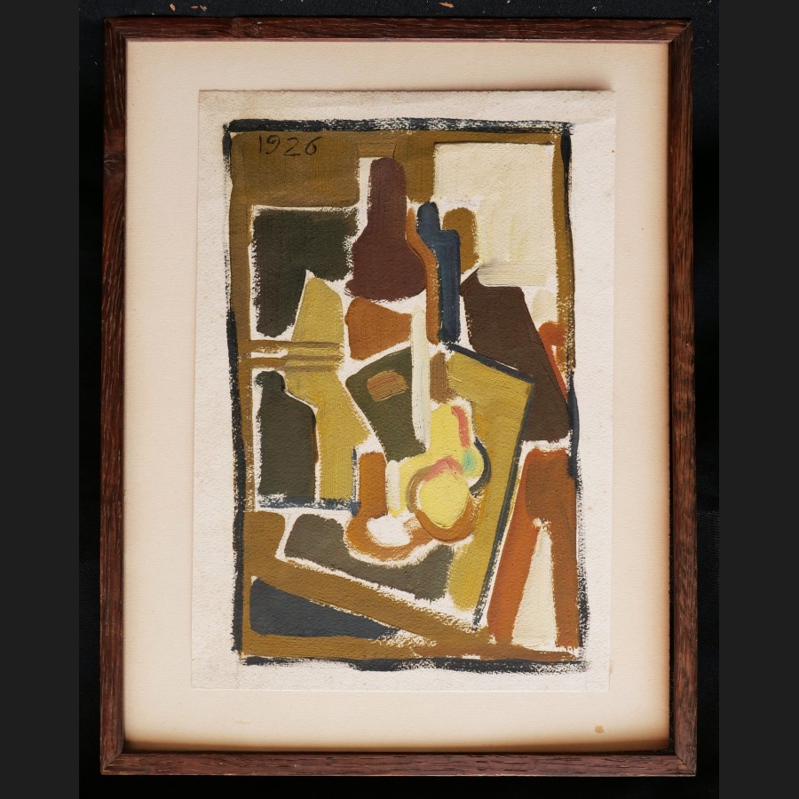 École FRANÇAISE en 1926Nature morte cubisteHuile sur papierDaté en haut à gauche 192626,5 x 18,5 cmCadre en chêne ciré