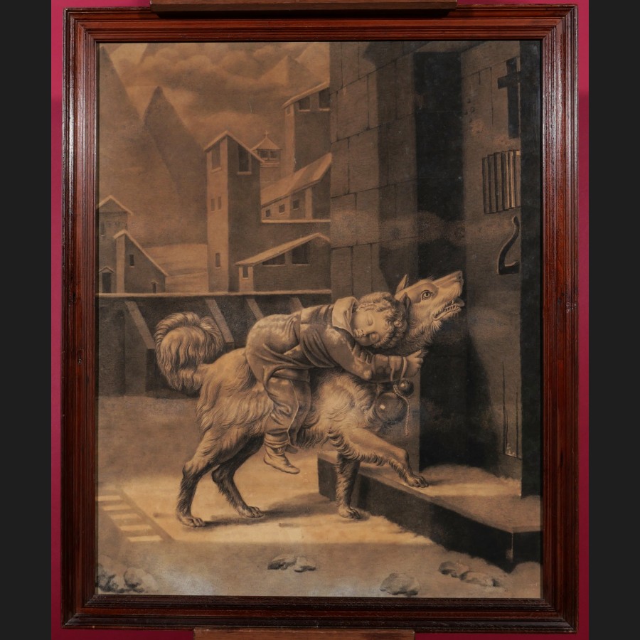 École FRANÇAISE ou SUISSE circa 1850, L'enfant sauvé par un chien de montagne, dessin