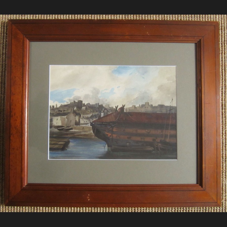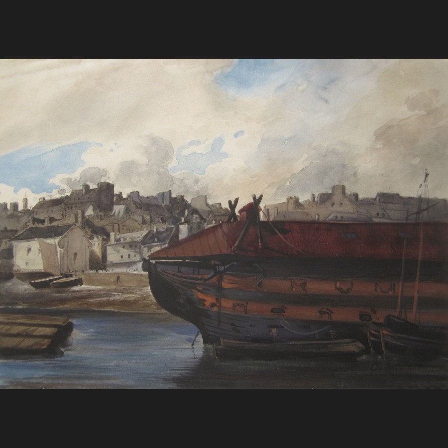 Charles Gabriel FORGET, Bateau devant une ville en Bretagne, aquarelle