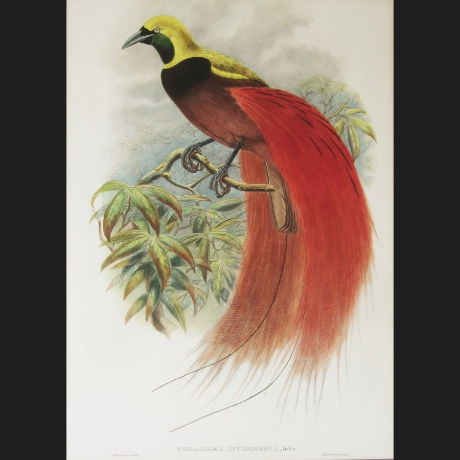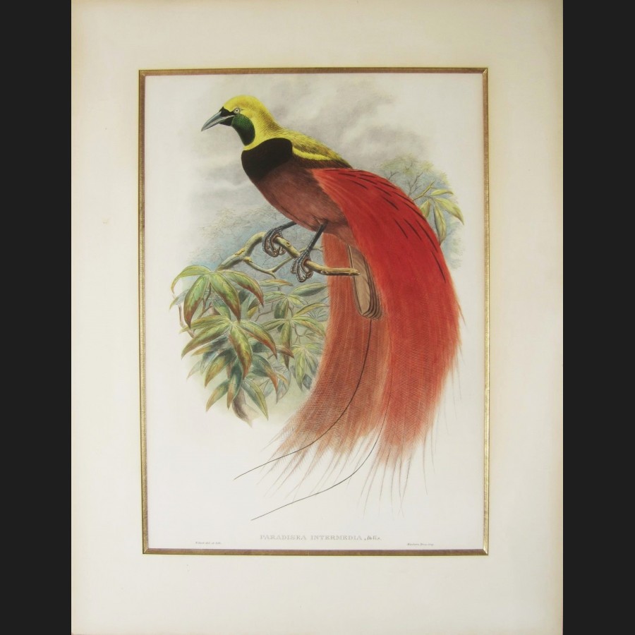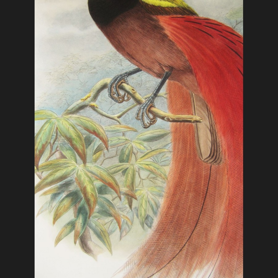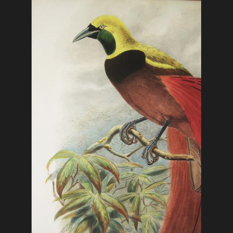 Lithographie rehaussée à la main à l'aquarelle et à la gomme arabique, plate 23 de la série Monograph of the Paradiseidae, or Birds of Paradise, and Ptilonorhynchidae, or Bower Birds, par Richard Bowdler SHARPE (London, 1847 – London, 1909)