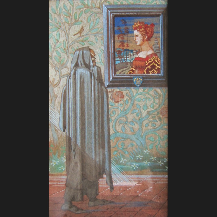 Que de richesse symbolique et de mystère dans cette aquarelle ! Il s'agit là d'un vieux thème germanique, celui de la Jeune fille et la Mort. Ce thème commence à apparaître dans les Danses Macabres des artistes allemands de la Renaissance. Il illustre, en mettant en scène une jeune et fraîche pucelle nue dansant avec des squelettes, le passage du temps, la menace de la mort aveugle et la vanité de la vie humaine, mais établit aussi un rapport déjà mis en évidence par les Anciens entre l'amour et la mort, la sexualité et la déchéance, Eros et Thanatos. De nombreux artistes célèbres vont s'emparer de ce thème : Niklaus Manuel Deutsch, Hans Baldung Grien, Franz Schubert, Edvard Munch, Egon Schiele ou encore Joseph Beuys. Mais à la différence des peintres qui ont insisté à plaisir sur l'érotisme de la chose, c'est à une réfléxion sur l'art même que Schnug nous invite. Le lieu semble être la salle d'un château décorée de freques médiévales, mais on pourrait aussi penser à un musée, où les oeuvres d'art, selon quelques pessimistes, viennent mourir. La Mort, vêtue d'un grand manteau à capuche et de coquettes poulaines, est plongée dans la contemplation du portrait d'une Bella Donna de profil en costume de la Renaissance. Un rayon de lumière traverse la scène. On ne sait s'il passe devant ou derrière la sombre Visiteuse. Il semble passer derrière et venir illuminer comme par magie une tomette du pavement, mais l'ombre sur le manteau de la Mort paraît cependant, étrangement, indiquer le contraire. La Mort observe, immobile. Elle se tient le menton avec le rictus qui lui est familier. On imagine le plus profond silence. Et pourtant quelque chose est en train de se passer. La lumière du matin darde son rayon magique et sur la fresque un oiseau chante sa venue, brisant symboliquement le silence de ce caveau muséal. L'interprétation de tout ceci est multiple, mais une idée semble dominer : les oeuvres d'art sont un défi lancé à la Mort. En pleine Guerre Mondiale, avec sa moisson de morts et de destructions (d'oeuvres d'art notamment), déjà hanté par l'alcoolisme et la démence qui le guette, Schnug semble vouloir nous dire tellement de choses dans ce dessin magique !