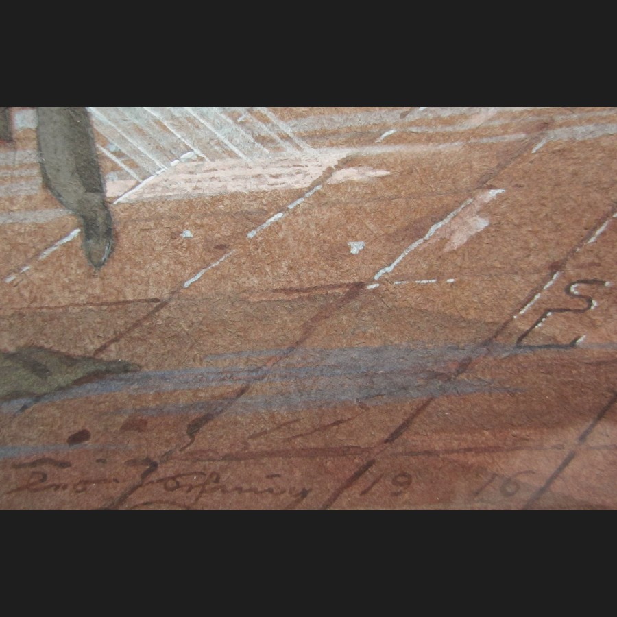 Cette petite aquarelle est un chef d'oeuvre du génial Alsacien Léo Schnug. Très recherché en Alsace, cet artiste, peintre et illustrateur, vécut une vie douloureuse et hantée par la folie, qui avait déjà frappé son père avant lui. Il commença sa carrière aux Art Décoratifs de Strasbourg puis partit se former à Vienne. Il adhéra au Kunschthaaf du Cercle de Saint-Léonard avec les artistes alsaciens Charles Spindler, Paul Braunagel, Auguste Cammissar, Benoît Hartmann, Léon Hornecker, Anselme Laugel, Henri Loux, Alfred Marzolff, Georges Ritleng, Joseph Sattler, Lothar von Seebach, Émile Schneider, et Gustave Stoskopf. Il connut une période de production intense jusqu' à la Première Guerre Mondiale. Ses oeuvres sont marquées par plusieurs thèmes, parmi lesquels prédominent la guerre et le Moyen-Âge. En 1912, il fut décoré par le Kaiser Guillaume II pour les freques qu'il exécuta à la forteresse du Haut Koenigsbourg. Enrôlé en 14, du côté allemand donc, il fut réformé en raison de son inaptitude et de son alcoolisme. Sa décoration par l'Empereur lui valut d'éviter les sanctions. En 1918, il fit un premier séjour à l'hôpital psychiatrique de Stephansfeld dans lequel il fut définitivment interné à la mort de sa mère en 1921.