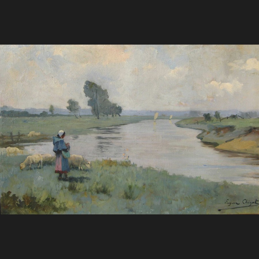 Eugene Henri A. CHIGOT, Bergere et ses moutons, tableau