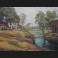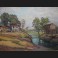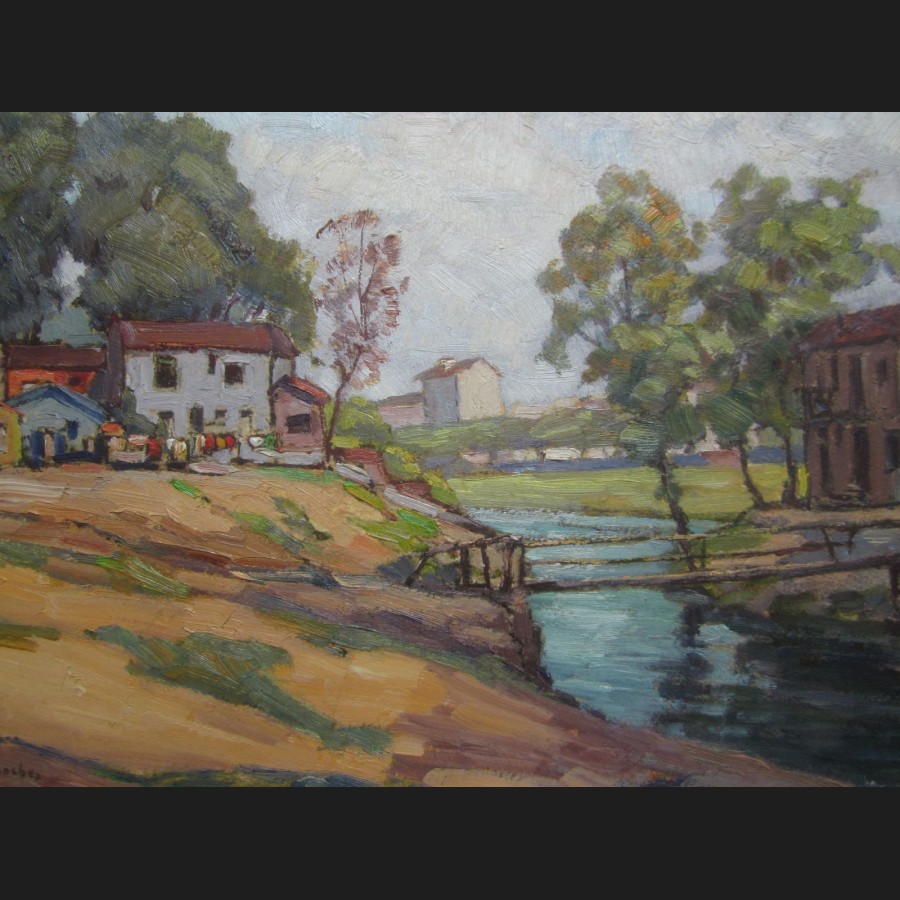 A. DEPLANCHES, Maisons et linge étendu en bord de rivière, huile sur papier