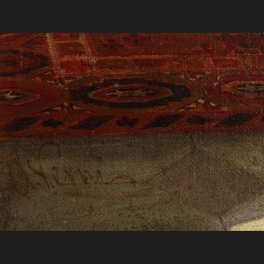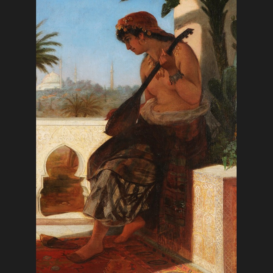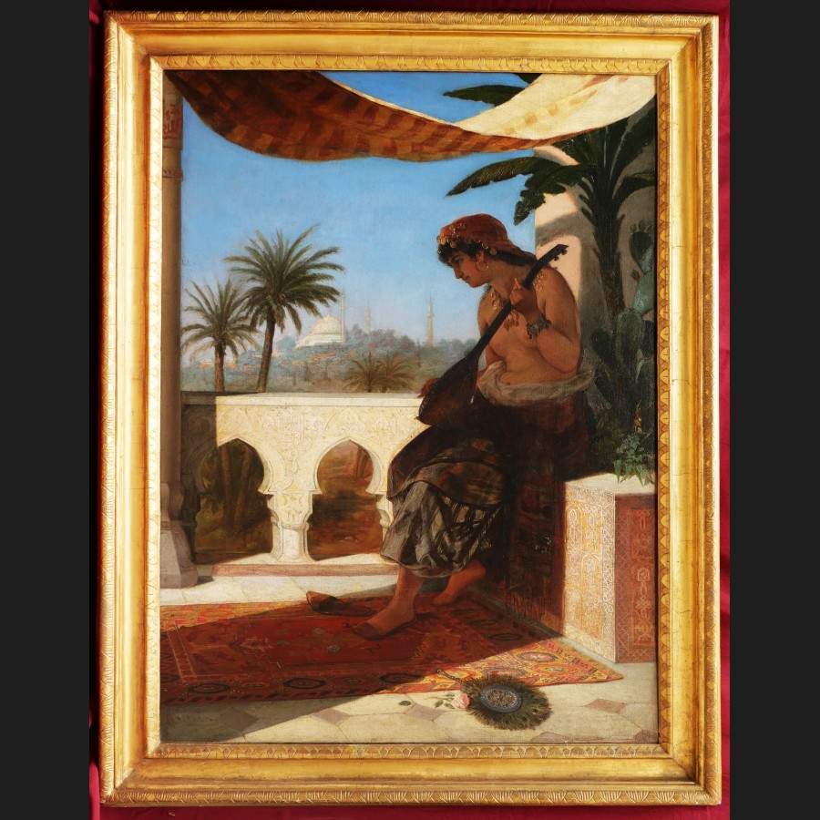A. VERNI, Femme jouant du luth sur une terrasse en Egypte, tableau