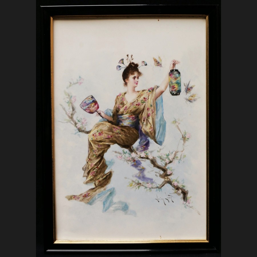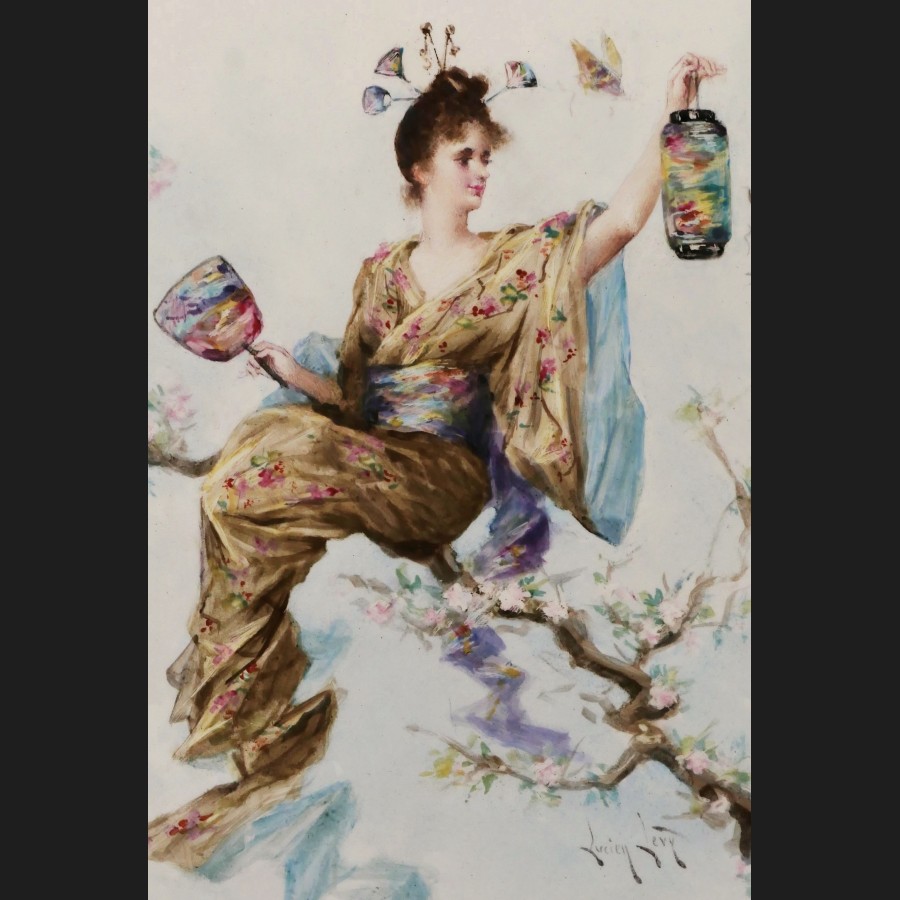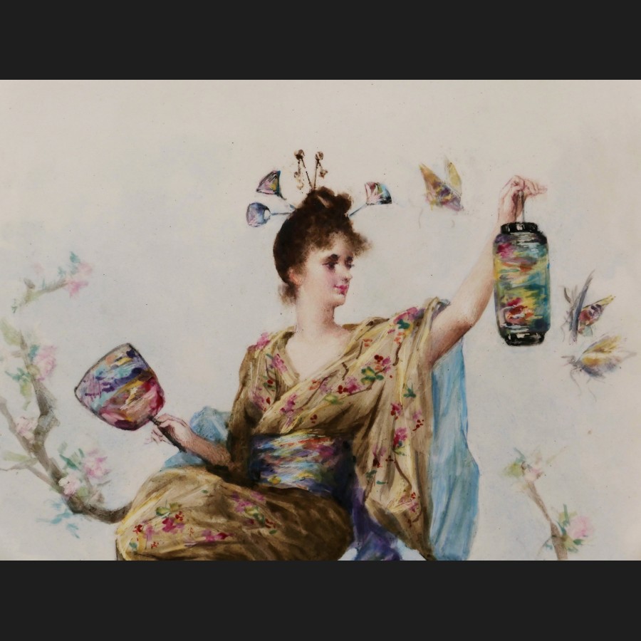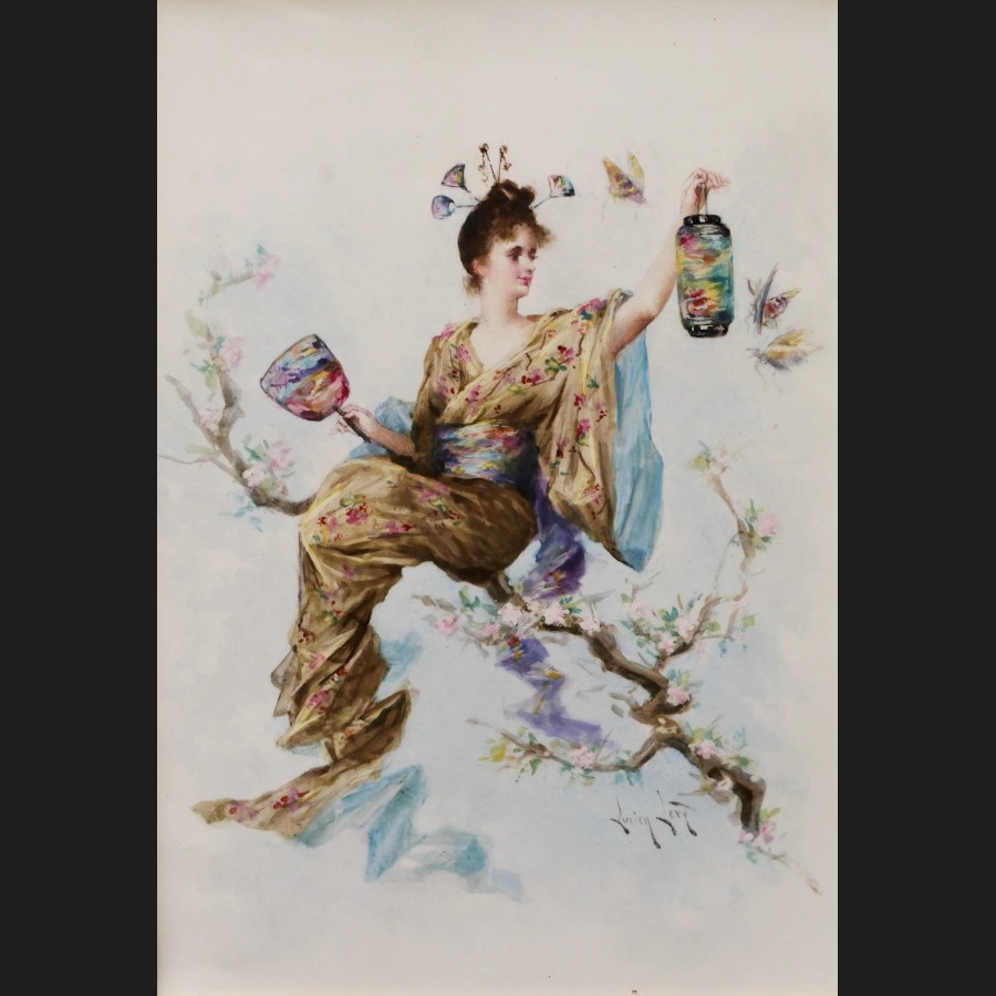 Lucien LÉVY-DHURMER, Femme japonisante à la lanterne, plaque de porcelaine
