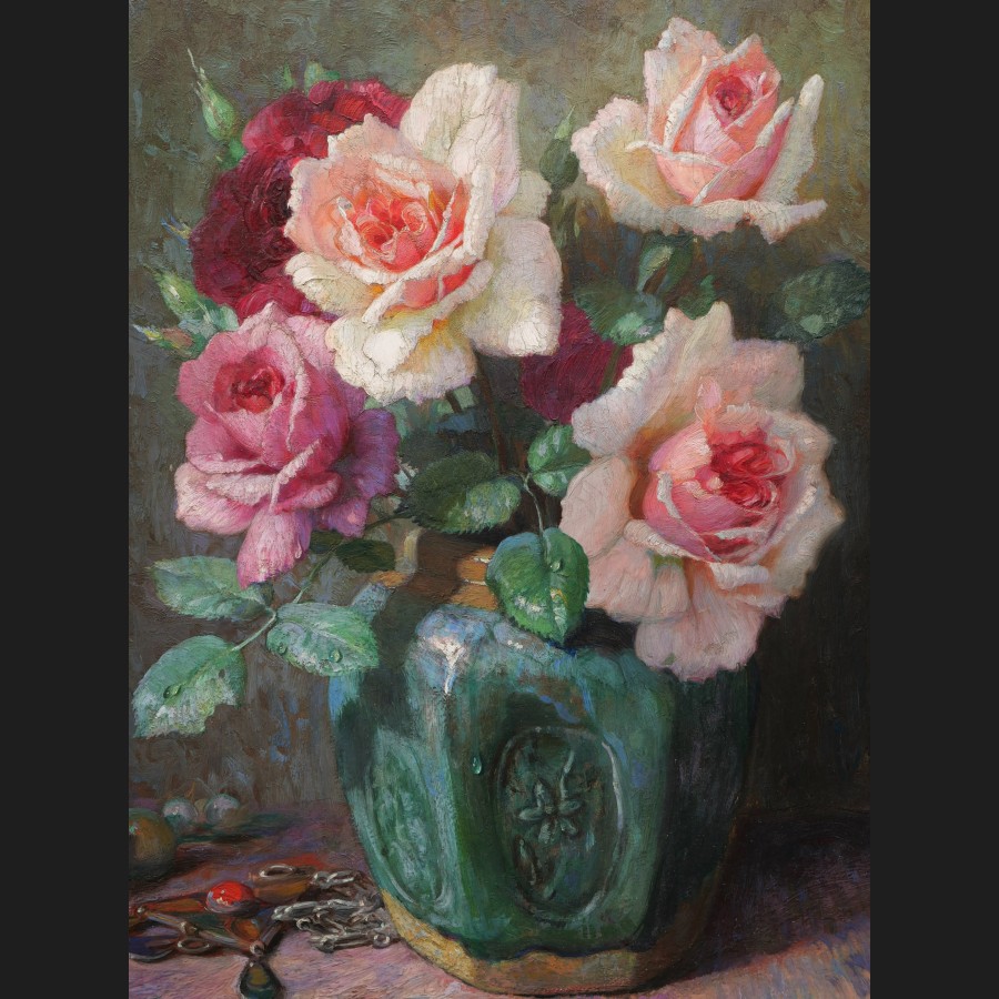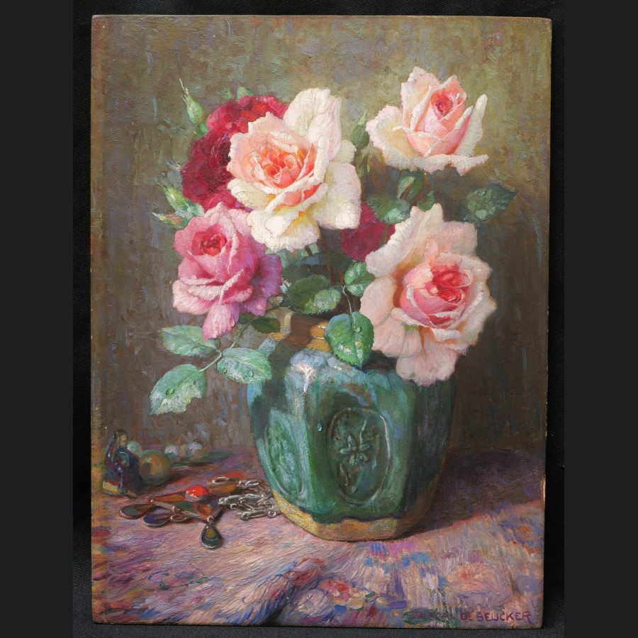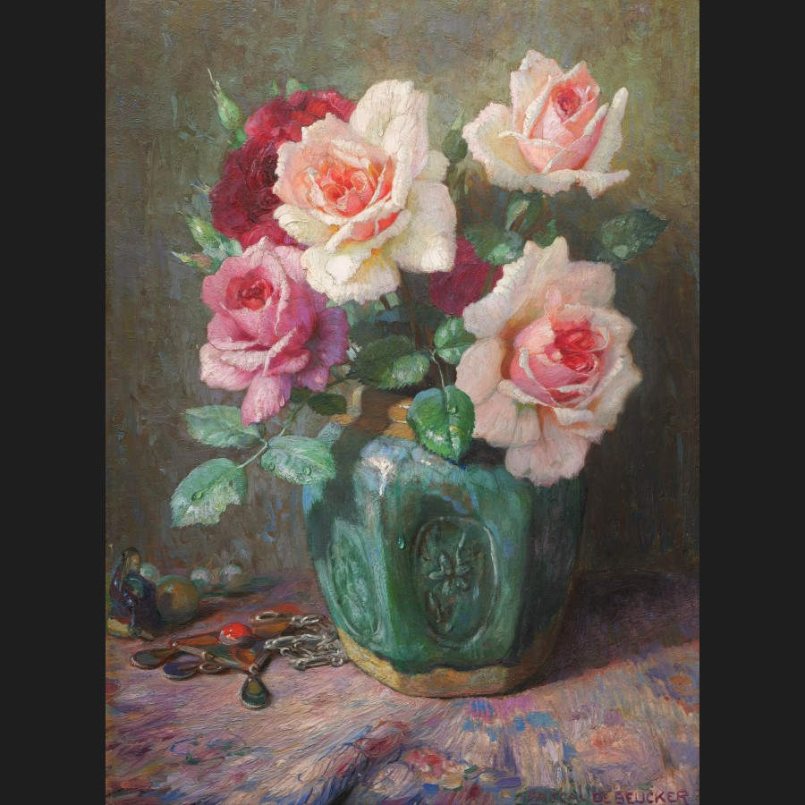 Pascal de BEUCKER, Roses dans un vase en grès vert, tableau