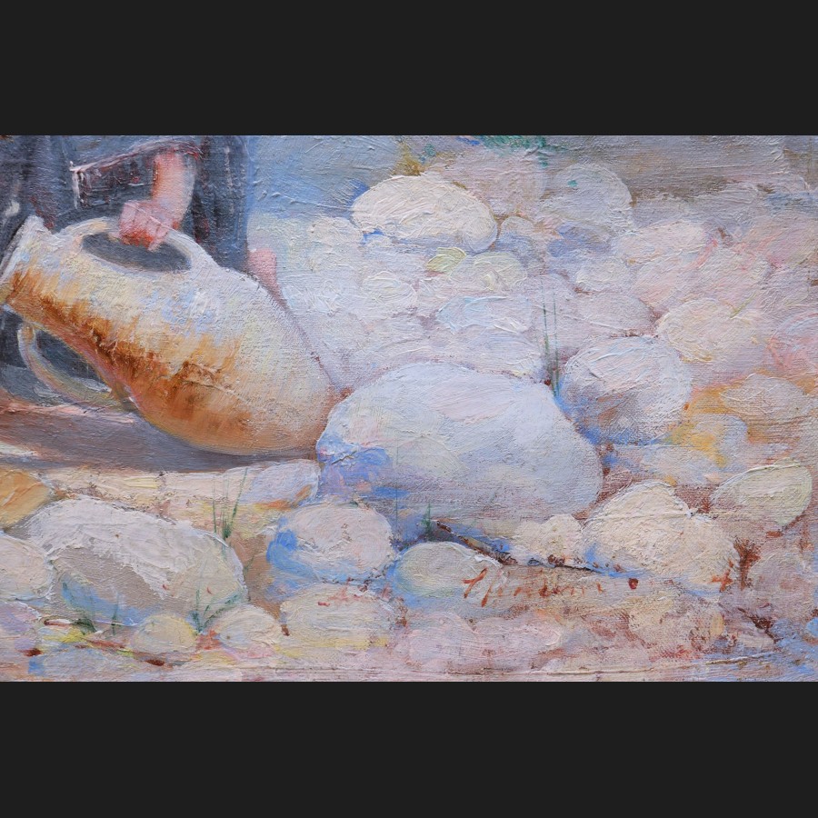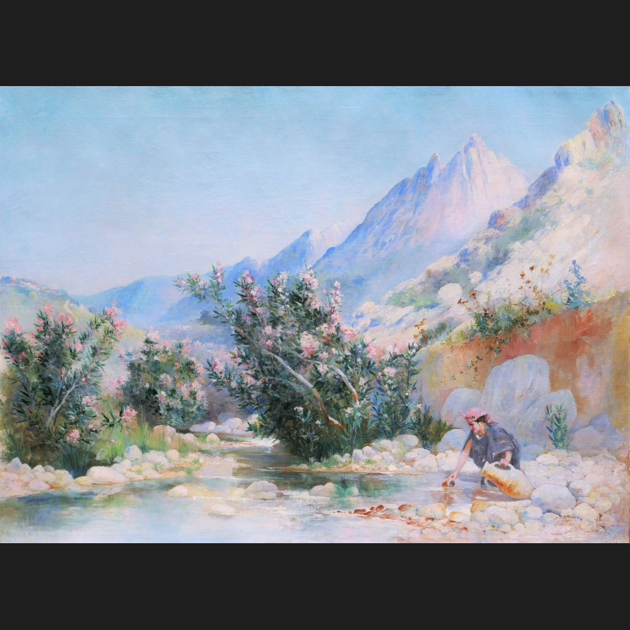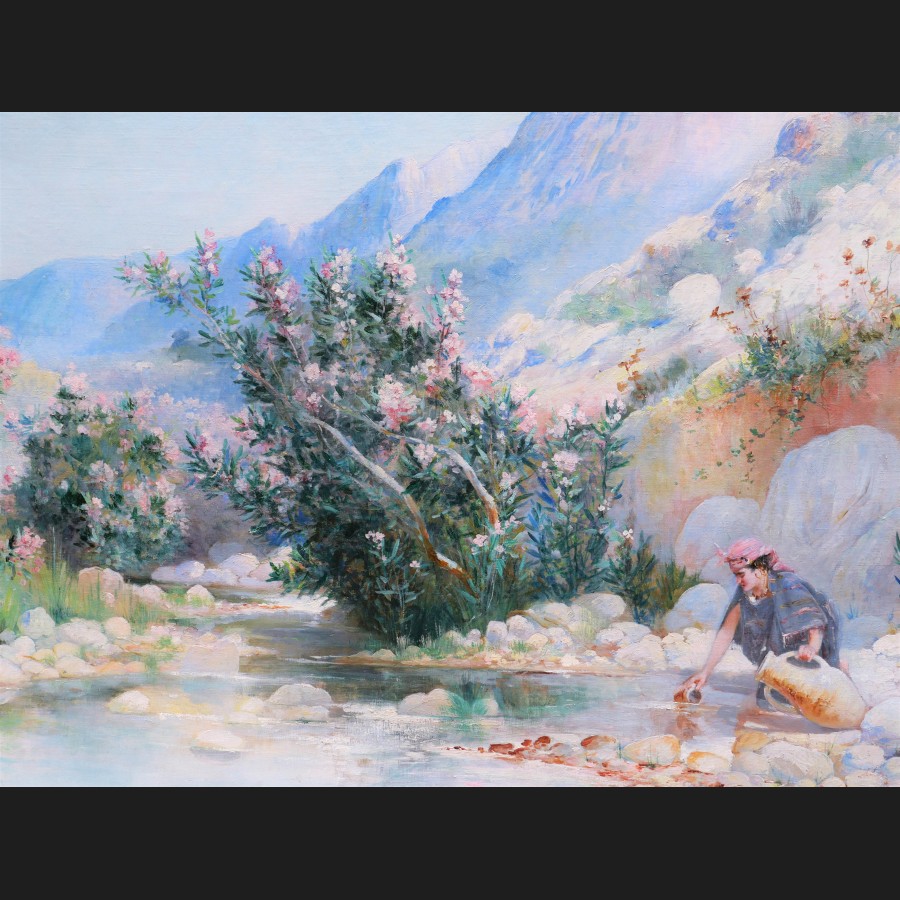 École FRANCAISE circa 1890, Femme puisant de l'eau dans une rivière, Algérie, tableau
