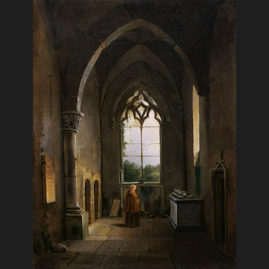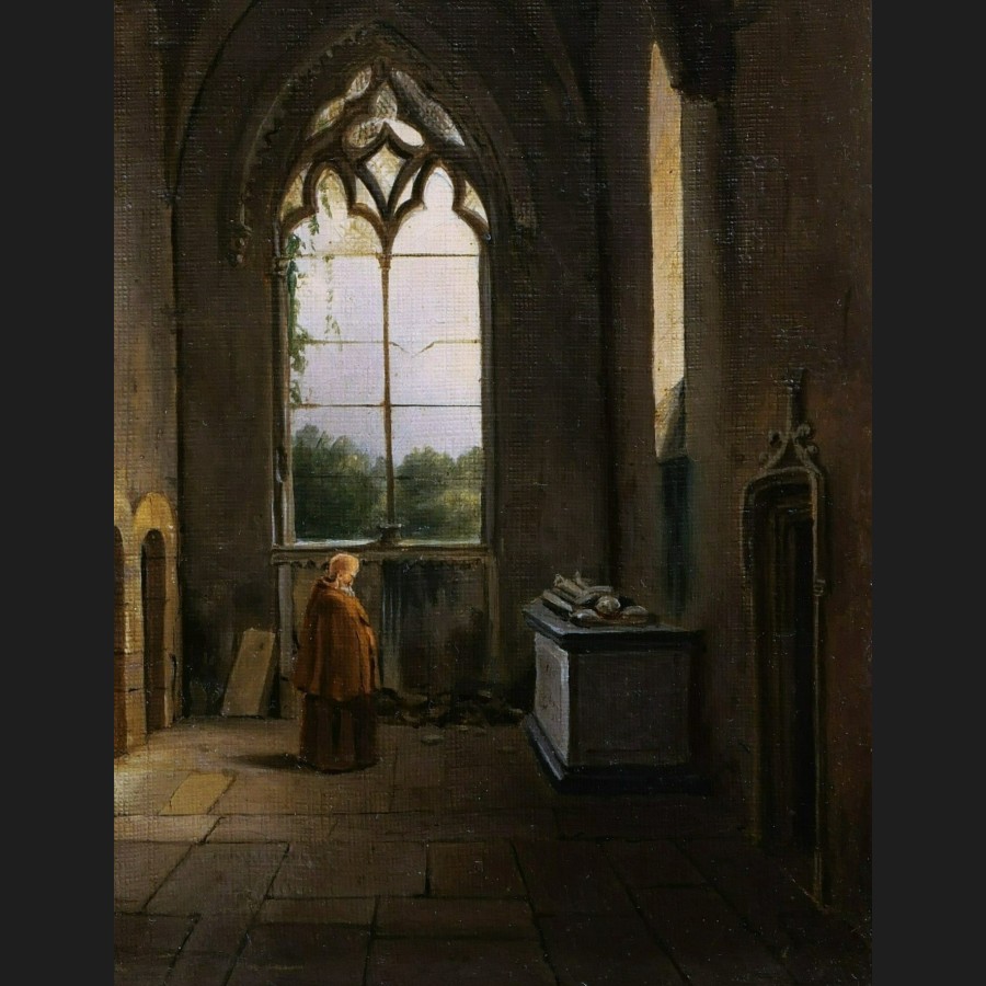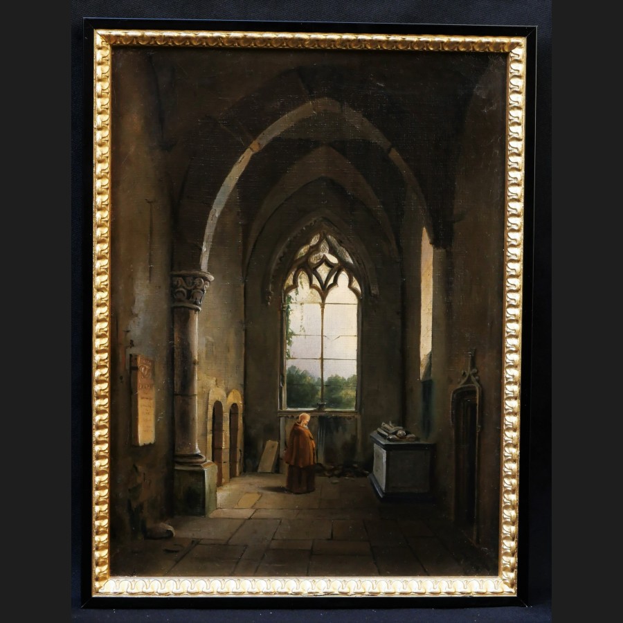 Attribué à Louis Jacques Mandé DAGUERRE, Moine en prière devant un gisant dans une chapelle, tableau