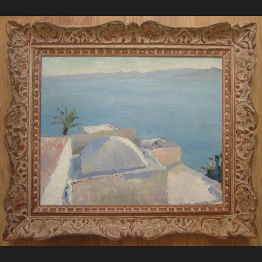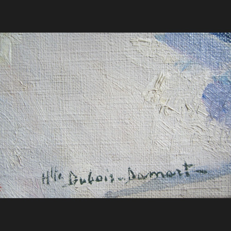 Henriette DUBOIS-DAMART était la femme du peintre orientaliste Paul-Elie DUBOIS, qu'elle accompagna dans ses voyages en Algérie,jusque dans le Hoggar, mais aussi au Maroc et en Tunisie, comme ici à Sidi Bou Said. Elle avait été l'élève de Tony Robert-Fleury, d'Adolphe Déchenaud mais surtout d'Odilon Redon, à la manière duquel elle exécuta de grandes compositions florales au pastel, dont une oeuvre vendue par la galerie Cerca Trova. Elle fut peintre de portraits, de natures mortes et de paysages, parmi lesquels les plus recherchés sont ses vues d'Afrique du Nord.Elle exposait au Salon des Artistes Français, dont elle fut médaillée d'or en 1935.