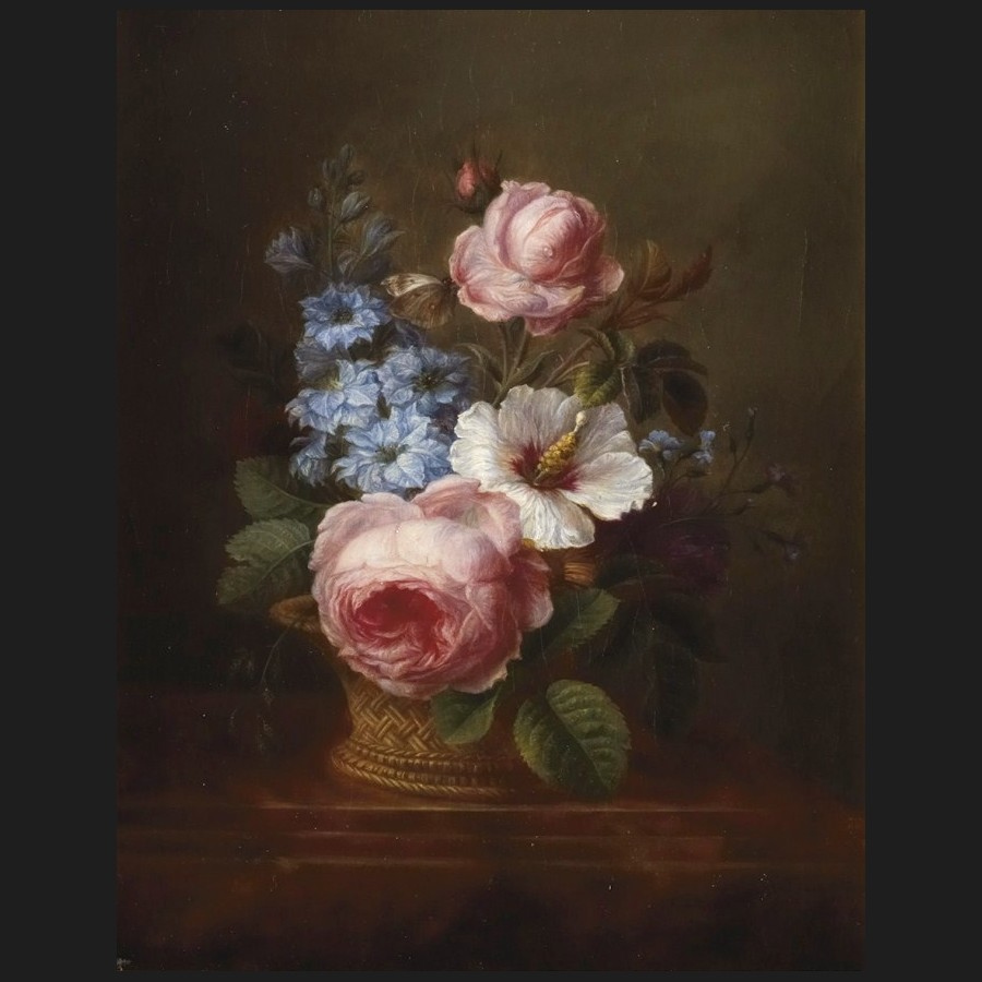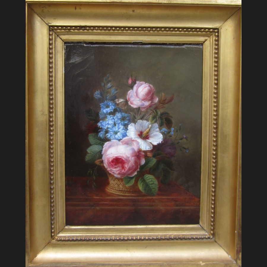 Voici une superbe nature morte de la première moitié du XIXème siècle, en parfait état et sur sa toile d'origine. Dans un panier d'osier tressé, un bouquet de fleurs que vient butiner un papillon blanc : trois roses dont une en bouton, un hibiscus des jardins (hibicus syriacus ou althéa) et des delphiniums.