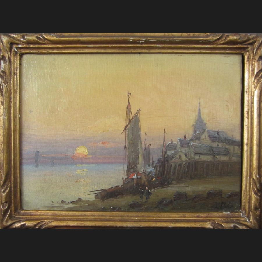 Attribué à Karl KAUFMANN, alias GILBERT, Vue d'un village en bord de mer au crepuscule, tableau